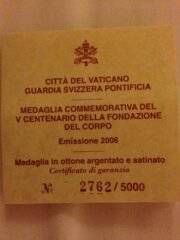 While we were in Rome, Bern had set us some “homework” on any public buildings ( ancient and modern) we would see the letters SPQR. Our task was to find out what it meant. We them wrote our answers on a piece of paper and the first correct answer drawn out of a hat would win a prize. I was lucky enough to have MY name drawn :). What a special prize!! Bern had bought a commemorative medal made for the 500th anniversary of the Swiss guards protecting the Pope at the Vatican. There were only 5000 of these made, so it is very special :). I have included a picture of this in this post.