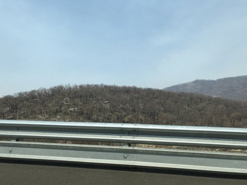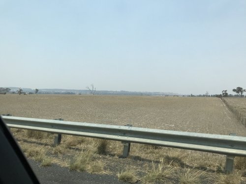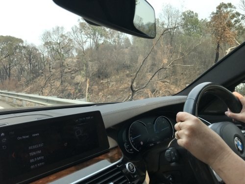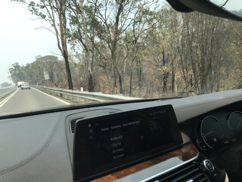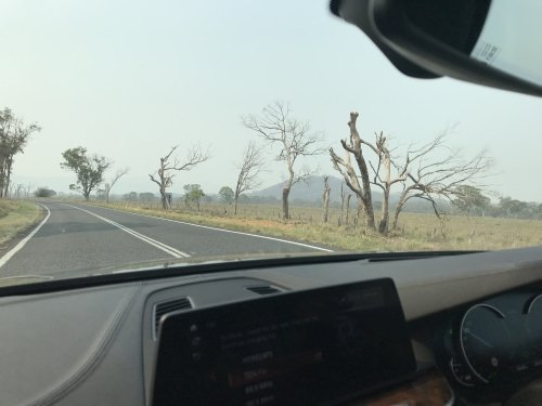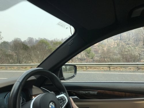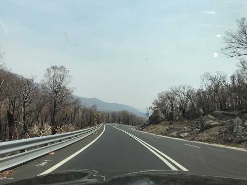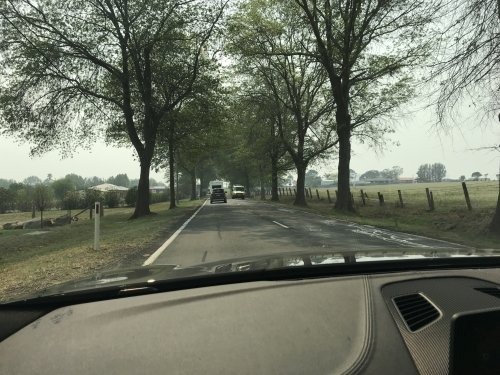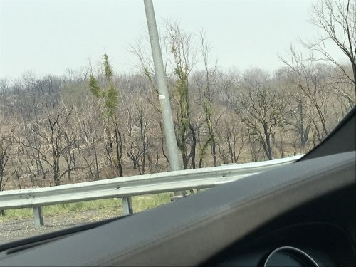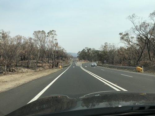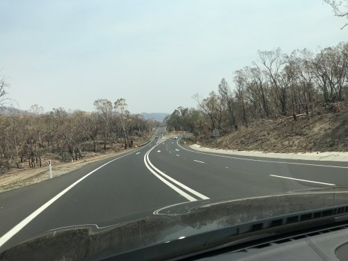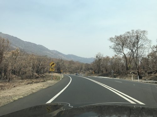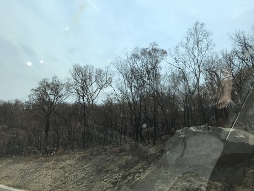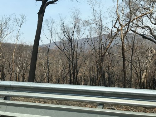 With the recent bushfires, there was a lot of smoke haze around Esk, I have downloaded the Australian Bushfire app and am confident that ( at this stage) we are not driving near any major blazes. Leaving Esk and heading up the range we saw the first signs of the devastation that the fires had brought. The normal scenery of green Aussie bush was transformed into a black desolate expanse. âč We saw farm trucks and tractors completely burnt out in the paddocks where they stood. Fences along the roadside were reduced to a length of wire strung between intermittent charred remains.