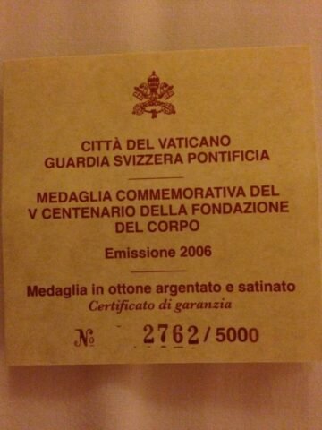 I was lucky enough to have MY name drawn :). What a special prize!! Bern had bought a commemorative medal made for the 500th anniversary of the Swiss guards protecting the Pope at the Vatican. There were only 5000 of these made, so it is very special :). I have included a picture of this in this post.