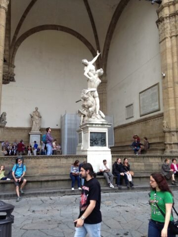 We then walked to the “piazza della signoria” this was the town square with a HUGE palace that is, even today, the centre of government for Florence. Florence was,in medieval times, a separate republic not controlled by Rome. Michelangelo’s David was commissioned for this square. The symbol of David defeating the giant is a metaphor for Florence defeating Rome