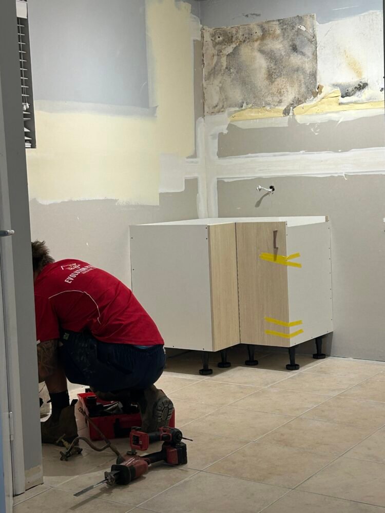 Mitchell the cabinet maker arrived about 7:30.  The plumber also arrived at 7:30 and between the two of them they were able to co-ordinate and cut the plumbing pipes down to where Mitchell needed them to fit the cabinets.